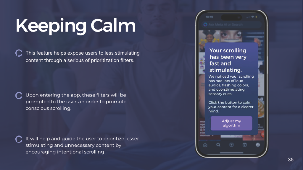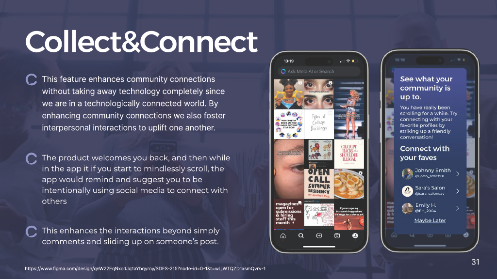 When mindless scrolling is detected, the app prompts the user to reconnect with others through meaningful interactions rather than passive viewing.