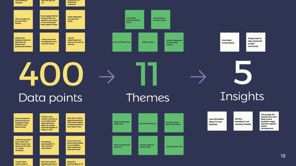 We sorted more than 400 data points into 11 thematic areas. These themes included attention span issues, emotional regulation, desire for meaningful content, and the need for healthier digital habits.