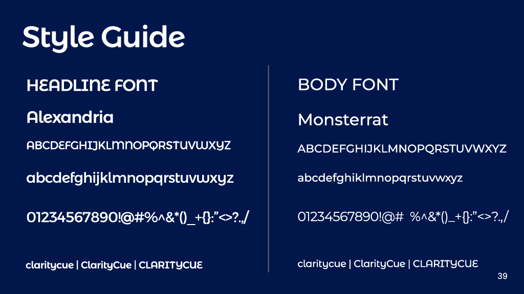 ClarityCue uses a soft color palette, friendly typography, and simple iconography to reinforce a calm and approachable experience. Alexandria is used for headings and Montserrat for body text to maintain readability and warmth throughout the app.