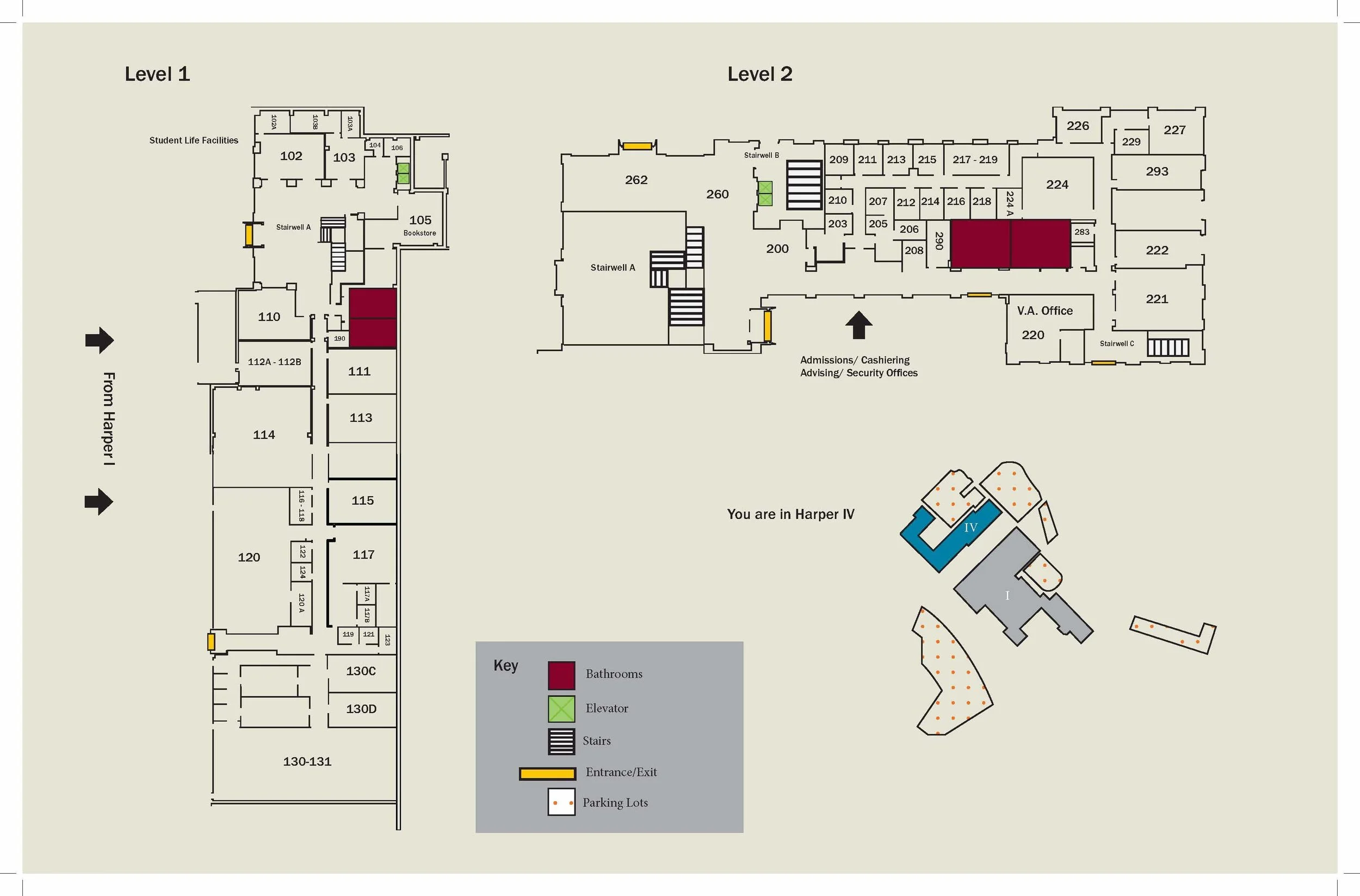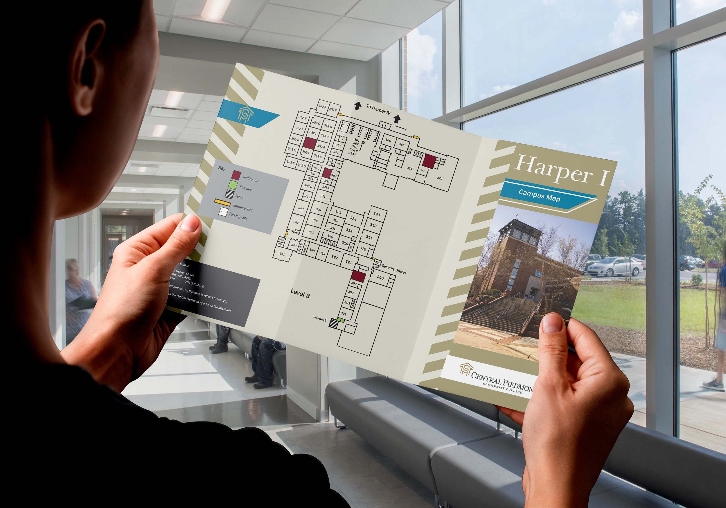At Central Piedmont Community College’s Harper Campus, navigation challenges created friction for new students, ESL learners, and visitors. Building layouts lacked clarity, signage was inconsistent, and essential destinations — including stairways, restrooms, and classrooms — were difficult to locate.